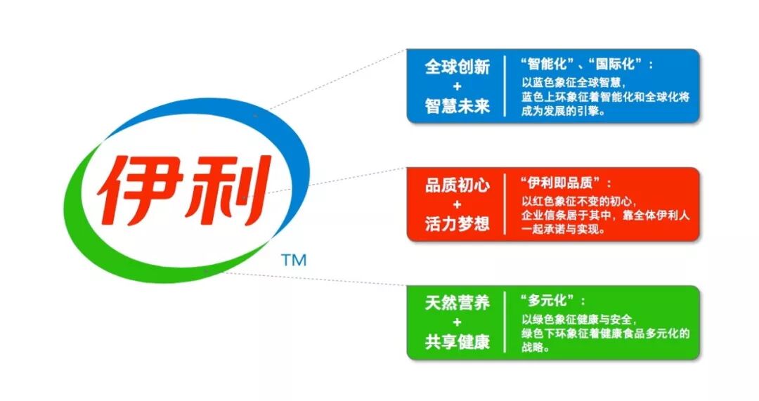 升级后的LOGO既传承了原有伊利品牌LOGO的核心资产——以原来蓝、绿、红三大基本色以及字体拼写方式为基础,又在视觉上优化升级——整体设计更加简约,椭圆形的蓝绿线条更加分明,字体也更加突出。同时每个颜色的寓意也发生了变化: