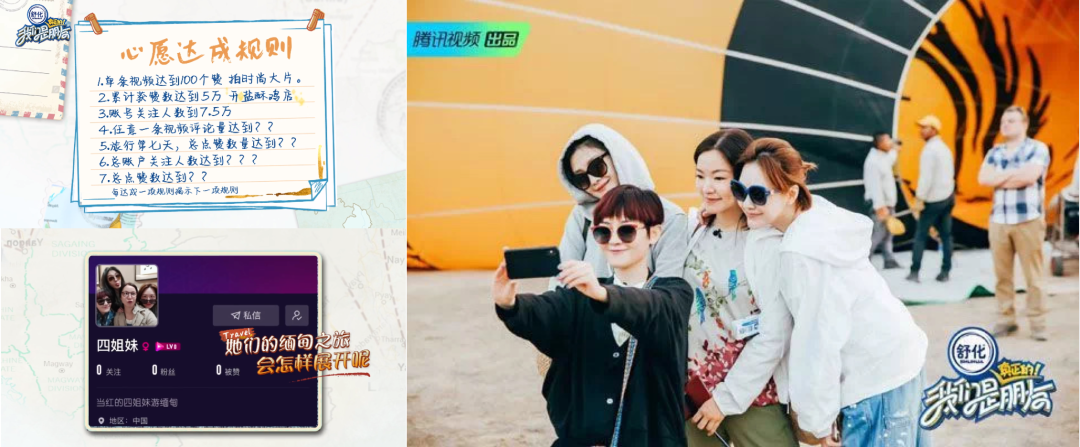 腾讯视频综艺节目《我们是真正的朋友》开始的第一件事,就是四姐妹在腾讯微视上开通了自己的账号「四姐妹」。从旅行开始,四姐妹通过微视记录旅途中的各种趣事。此外,微视不仅是旅程的记录者,也是节目推进的线索之一,四姐妹通过微视完成如「单条视频达到 100 个赞」等一系列任务,就能达成「心愿」。节目通过微视任务激发明星进行记录、产出内容,粉丝通过评论、点赞等方式引导与明星产生互动,拉近距离,增加参与感,双方互动的情况下推动的节目进程。微视也借此展现出平台作为用户日常陪伴,帮助用户发现更有趣生活的品牌形象,并在节目中自然而然地完成场景教育。
