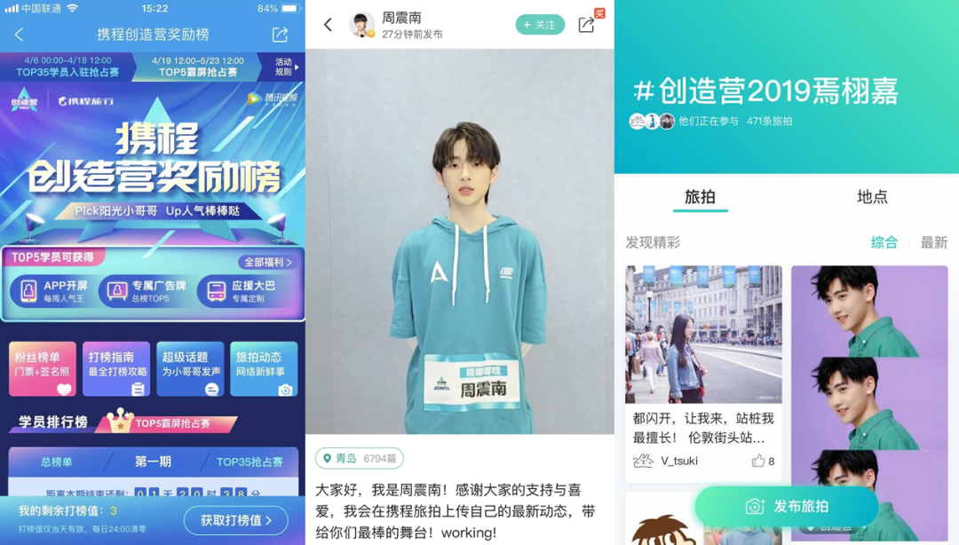 去年夏天「出圈」的综艺节目腾讯视频《创造营 2019》,在和携程旅行的合作中就跳出过往综艺单一植入的局限,转向为用户提供基于优质内容的服务和体验。针对携程推出面对年轻用户的旅行分享社区「携程旅拍」的产品特性,节目邀请《创造营 2019》打榜最多的前 35 位「小哥哥」集体入驻平台,吸引大批粉丝加入共创,无形中实现品牌对用户的渗透。在「携程旅拍」内,粉丝可以为入驻的学员打榜加油,通过互动还能获得额外携程旅拍内的打榜值,并解锁学员的资源福利。最终「携程旅拍」参与活动人数超过 200 万,发布相关旅拍内容超过 40 万条。